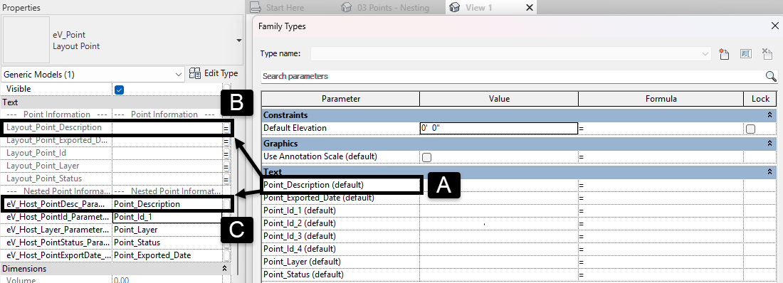 - Within the Host family (A) create a series of instance text parameters that align with the point family.