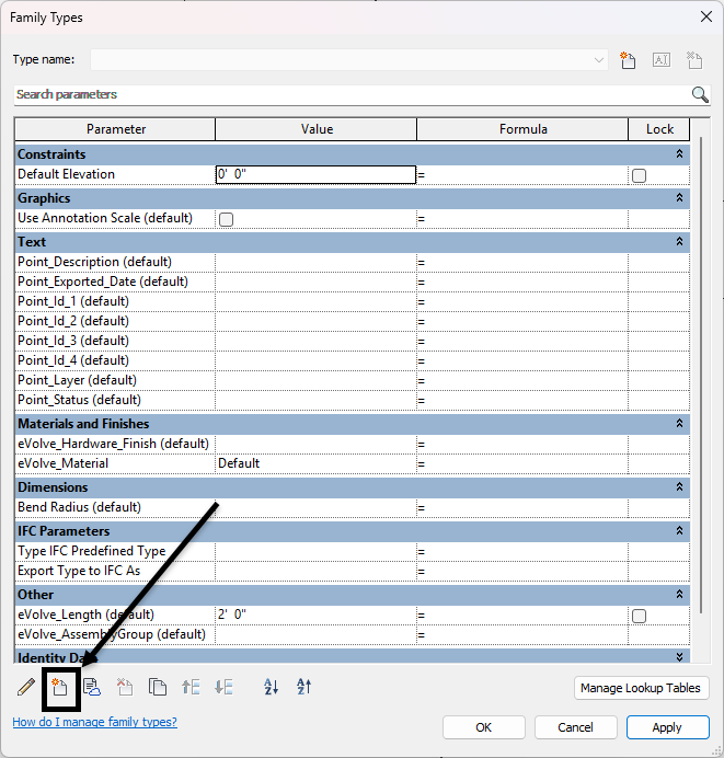 - From the Family Types window, click Create New Parameter.