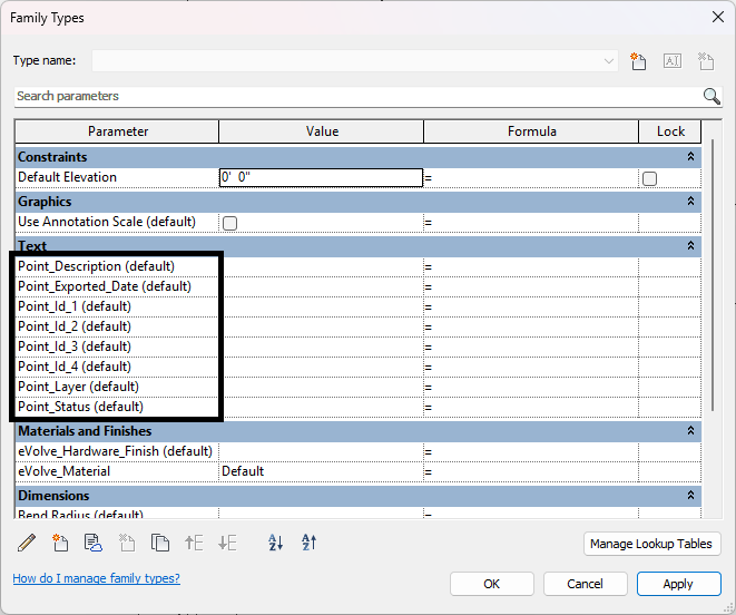 - If multiple points exist in a family, you'll want a unique point id parameter, but only one instance of the other parameters, e.g., Point_Id_1, Point_Id_2, etc.