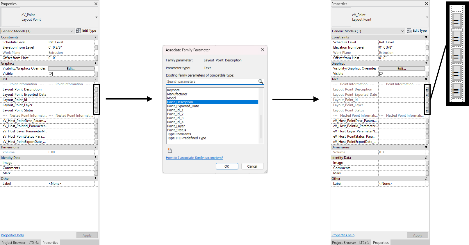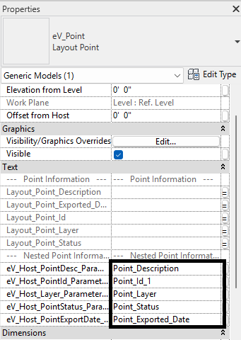 In the Properties Palette, "link" the existing point parameters to the new parameters in steps 2-4 in the Creating New Parameters section above.